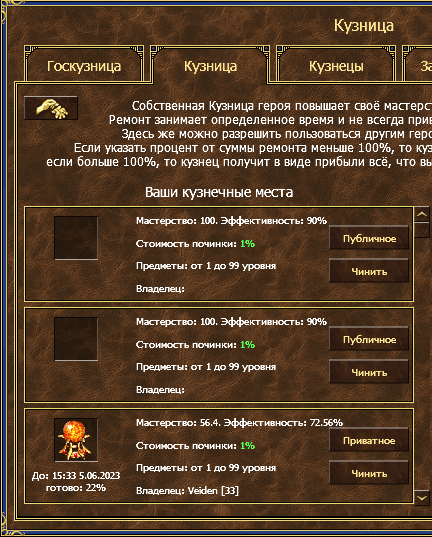 На соседней вкладке "Кузница" можно купить себе собственное кузнечное место за 100к + ресурсы. Купить можно несколько мест одновременно, однако стоит учесть, что каждое место имеет свой уровень мастерства и прокачивается отдельно, независимо от других мест.