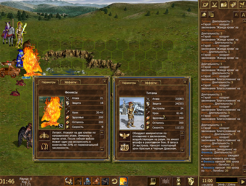 Начало боя: Гранулы, замедление на фениксов из книги магии, ожидание хода черными архангелами.. Дальше должен быть ход титанов, но неожиданно фениксы ходят раньше них.