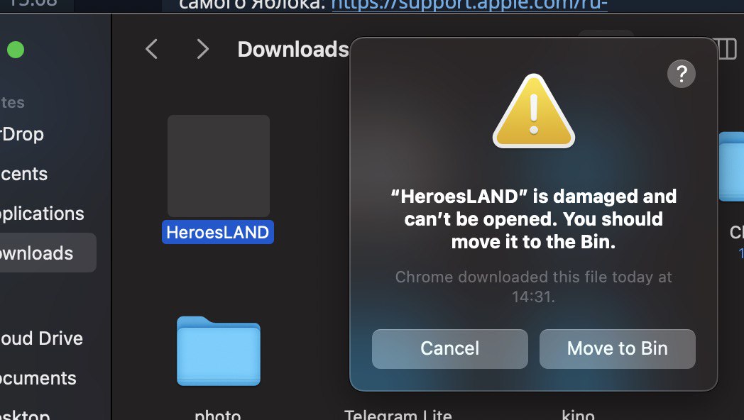 Лучше в каталоге пользователя создать папку, например, hl. В неё перетащить из Downloads загруженный с сайта клиент. Запустить терминал. Перейти в папку, судя по картинке, это будет "Macintosh HD-Users-pro-hl". Проверить там наличие программы командой "file HeroesAND.app". Если терминал выдаст "HeroesAND.app: directory", то ввести команду "sudo xattr -dr com.apple.quarantine HeroesLAND.app" и подтвердить её паролем.